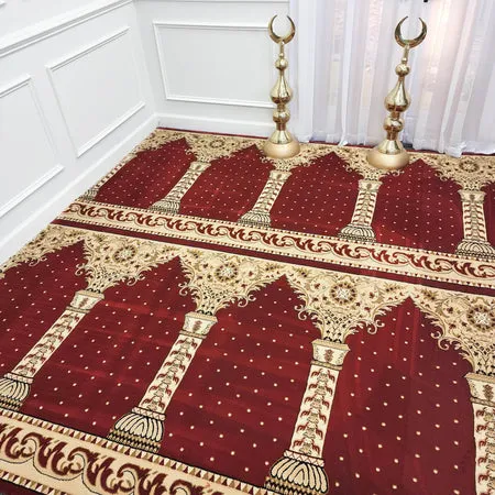Enhance your mosque with the AQSA Royal Maroon™ Arch Mosque Carpet, offering 14mm thickness and 880,000 points per square meter for plush comfort and support. Made from 100% premium polypropylene with antibacterial and easy-to-clean properties, it delivers durability, hygiene, and a luxurious prayer experience for high-traffic areas.