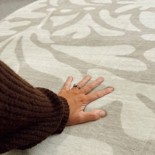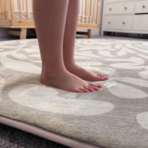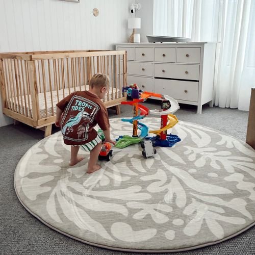 Gerda Green Grey Leaves Round Carpet is a fun and comfy playmat, designed to provide a soft, spongy landing for little feet (and big feet too!). Perfect for playtime or tummy time, it features a velvety, satin-smooth surface, thick 20mm memory foam, and a built-in non-slip underlay for safety. Lightweight yet plush, this playmat is easy to move and maintain. Spot clean only.