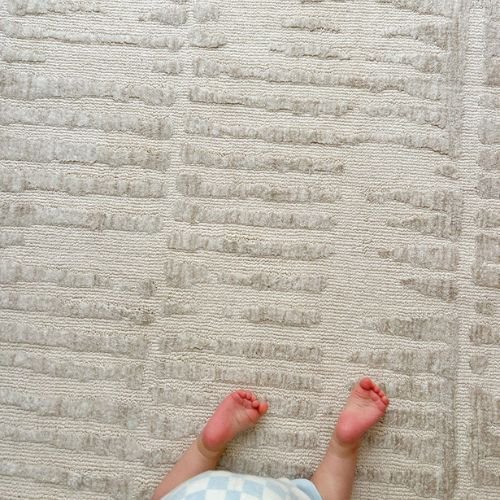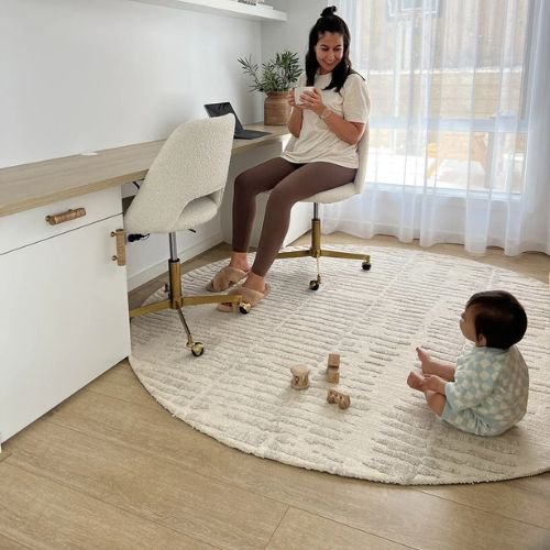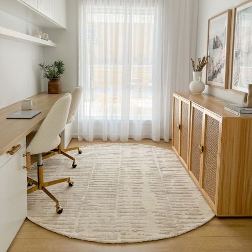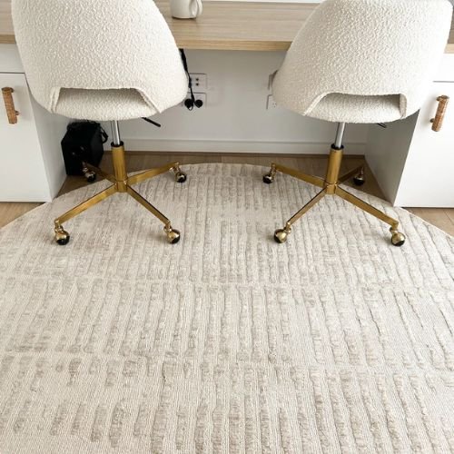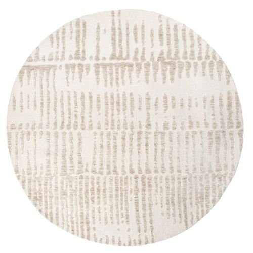 Nahba Cream Textured Round Carpet features a unique transitional distressed design, making it a luxurious addition to modern, tribal, minimal, or bohemian interiors. It beautifully complements warm tones, neutral shades, and natural color palettes.