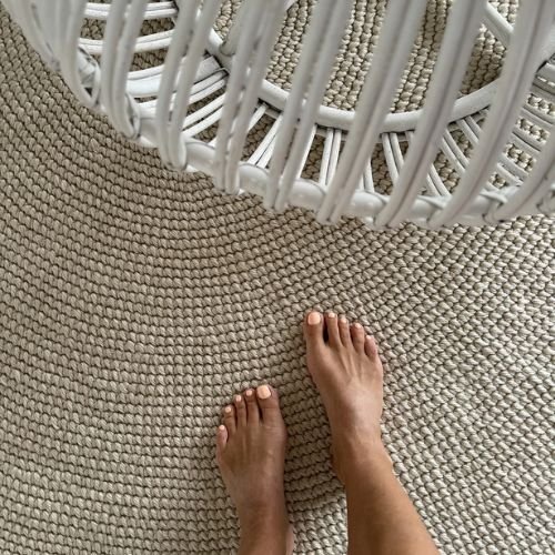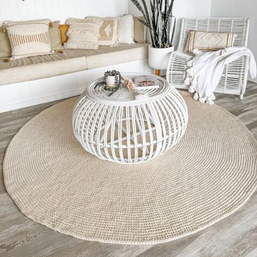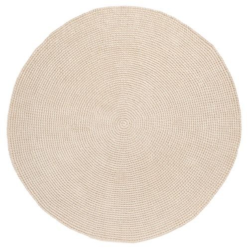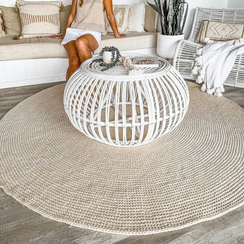 Nessa Beige Indoor Outdoor Round Carpet is a beautiful light beige rug featuring a textured crochet design. Handwoven from 100% recycled PET yarn, it has 15mm thick braids and stain-resistant qualities, making it low-maintenance and easy to care for. Eco-friendly PET is made from recycled plastic bottles but feels soft and smooth underfoot, just like cotton.