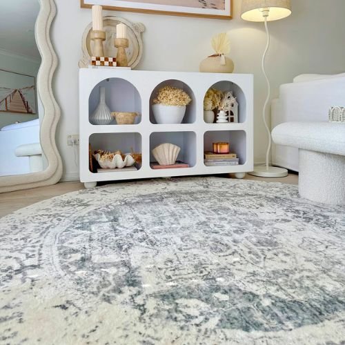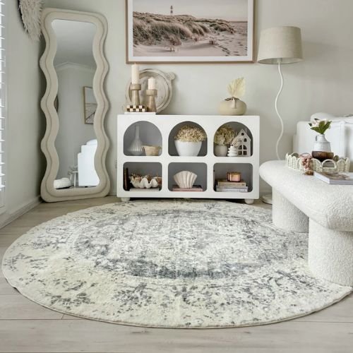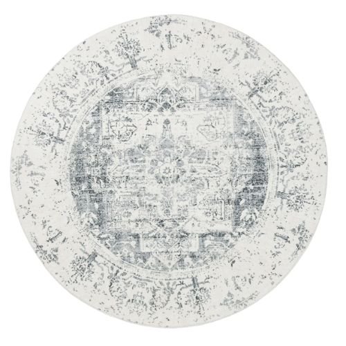 Yelina Grey Distressed Washable Round Carpet: Yelina is a beautiful, foldable, and washable rug with a traditional medallion design. Featuring a bordered distressed style with ornate motifs in grey and cream tones, its printed design gives a subtle vintage, faded effect. This timeless rug adds elegance to modern, classic, bohemian, or vintage spaces.