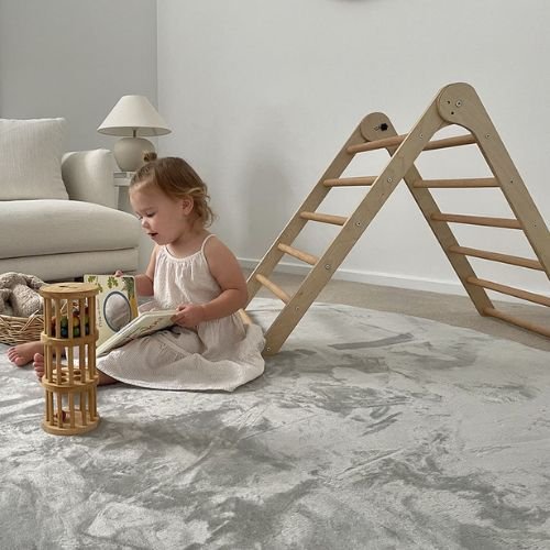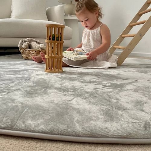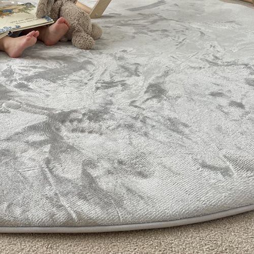 Zia Grey Plush Round Carpet: Zia Grey Plush Round Carpet is a luxurious silver-grey rollie pollie playmat, designed to provide a soft, spongy landing for little feet (and big feet too!). Perfect for playtime or tummy time, it is velvety soft with a smooth satin-like finish. Made from 100% polyurethane foam, this thick and plush mat is lightweight and comes with a built-in underlay to keep it safe and securely in place.